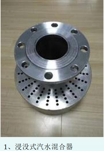 浸沒(méi)式汽水混合器 主要由外殼和芯體組成,外殼上下分布大小孔,芯體周圍分布小斜孔。外殼和芯體之間是高效混合加熱區(qū)。工作時(shí),蒸汽從芯體小斜孔,高速噴入混合器加熱區(qū),推動(dòng)加熱區(qū)內(nèi)的水高速上旋轉(zhuǎn),同時(shí)完成汽水混合換熱。同時(shí),被加熱的水在上旋轉(zhuǎn)過(guò)程中,不斷從外殼上部孔排出,下部孔補(bǔ)充,對(duì)水箱中的水循環(huán)加熱。