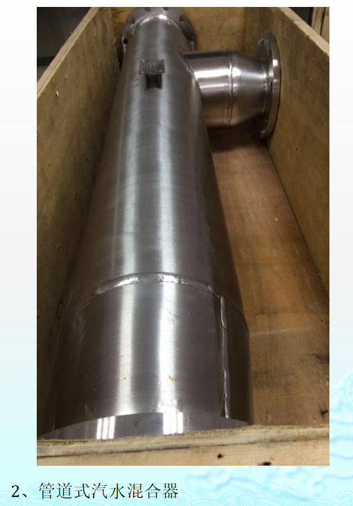 管道式汽水混合器主要由噴管、殼體、網(wǎng)板等部分組成。被加熱水通過(guò)呈拉法爾管狀的噴管時(shí),蒸汽從噴管外側(cè)通過(guò)管壁上許多斜向小孔噴入水中,二者在高速流動(dòng)中瞬時(shí)良好混合,以達(dá)到加熱水的目的。